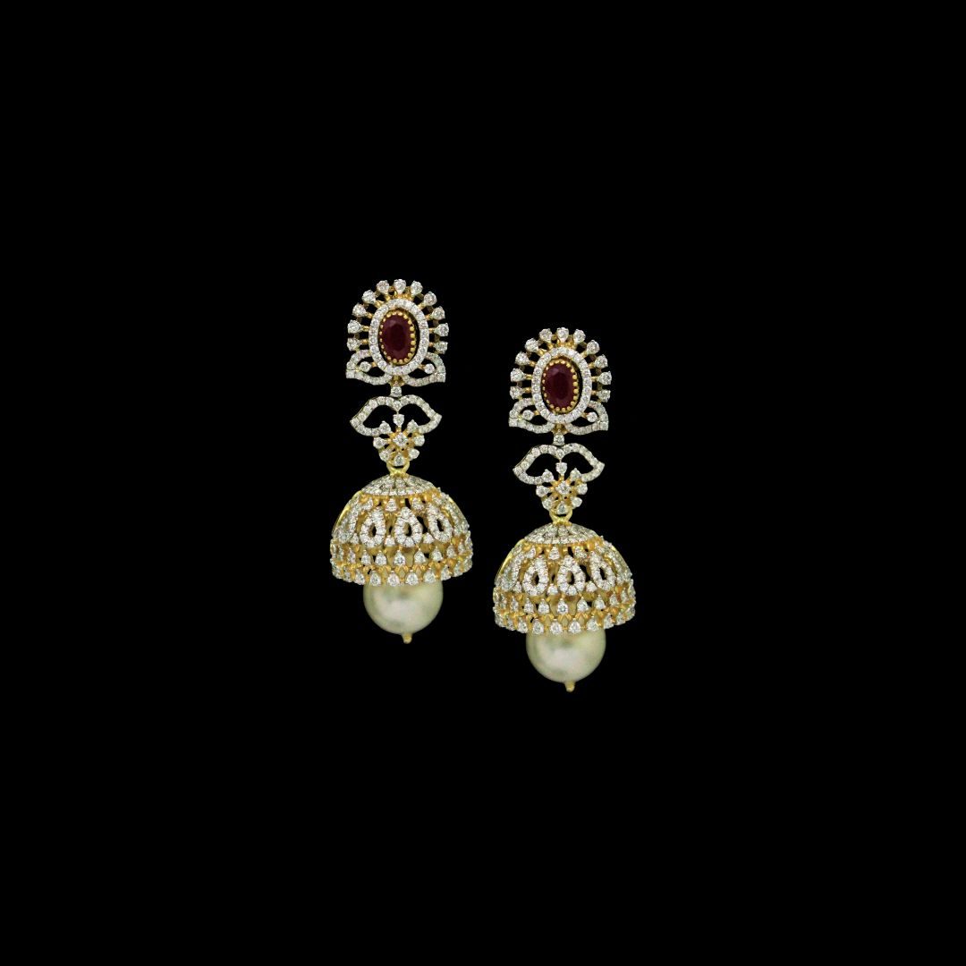 At the heart of each jhumki sits a vibrant ruby, serving as the centerpiece. The ruby, with its rich red hue, adds a burst of color and contrast. Nestled between the two layers of diamonds, it becomes the focal point, infusing PER0706 with a touch of regal elegance. This ruby centerpiece elevates the design, creating a captivating contrast against the sparkling diamonds.