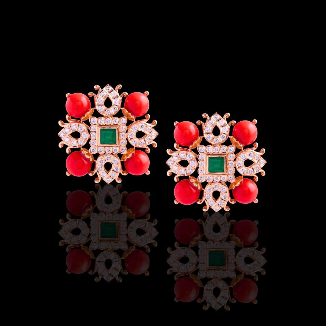 PER1512 | 18kt Gold Diamond, Emerald, and Coral Earrings | Kothari Jewellers