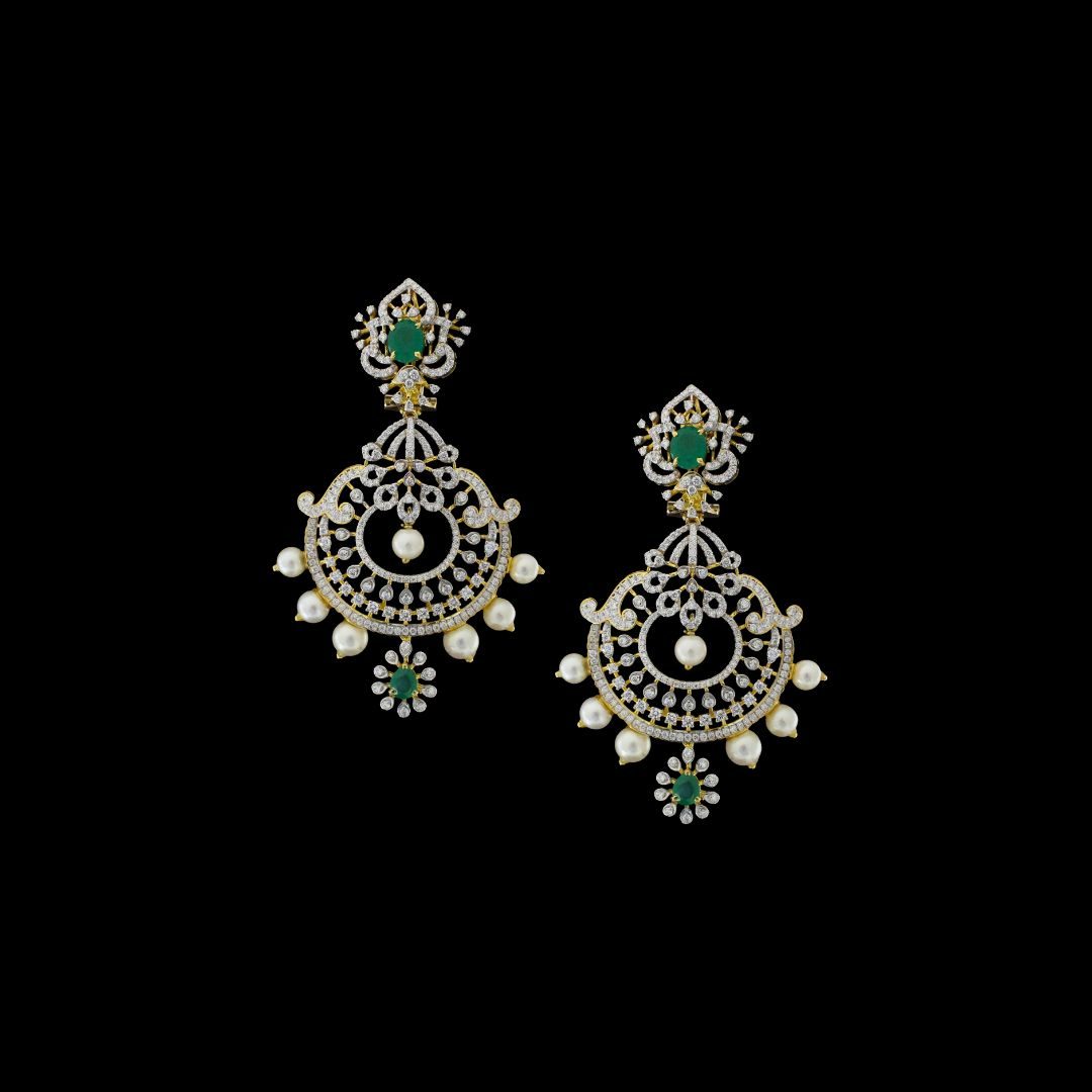 The PER1811 diamond jhumki from Kothari Jewellers is a luxurious piece designed to catch the eye and stand out in any crowd. Made from high-quality 18 kt gold, this jhumki features sparkling diamonds, rich green emeralds, and a unique chand bali design. With the addition of radiant pearls, this stunning jhumki is perfect for special occasions, weddings, and cultural celebrations.