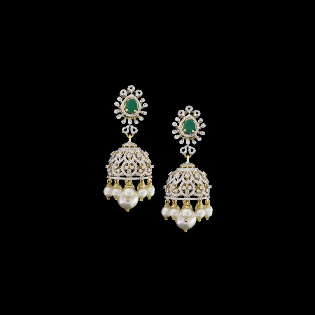 At the base of the jhumki, a single hanging pearl adds a delicate and graceful finish to the piece. The smooth and lustrous pearl offers a subtle glow, which contrasts beautifully with the sharp sparkle of the diamonds and the rich colour of the emeralds. The pearl brings a soft, flowing movement to the jhumkis as they dangle, adding a dynamic quality to your jewellery. Whether you’re on the dance floor during Garba or enjoying a family gathering, the hanging pearl will catch the eye, enhancing your overall look with its soft, graceful movement.