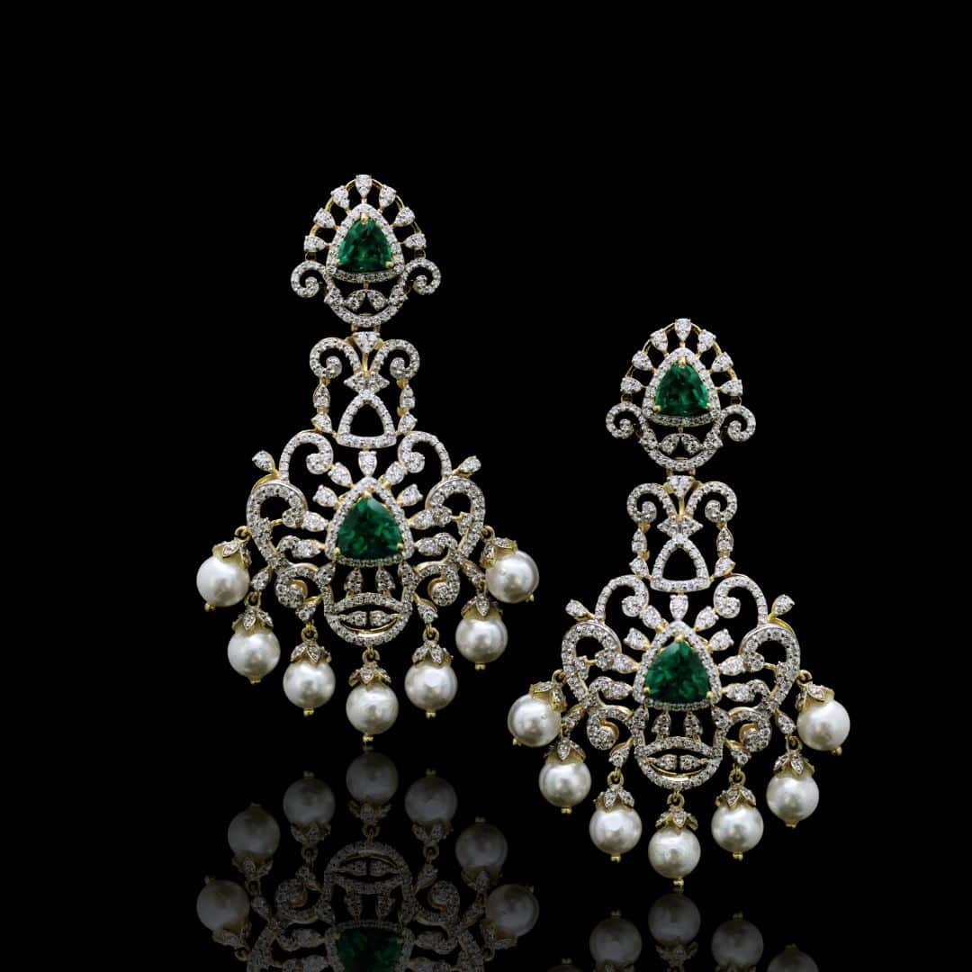 Elegance Redefined PJER-301 Two-Layered Diamond Earring with Emeralds and Pearls