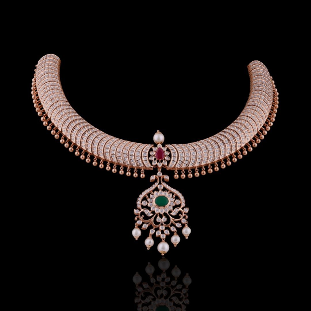 The PNK0937 necklace, a masterpiece from Kothari Jewellers, is a stunning and elegant piece that will elevate any outfit. This exquisite necklace features a captivating arrangement of round diamonds, vibrant green emeralds, and radiant rubies, set in 18-karat rose gold.