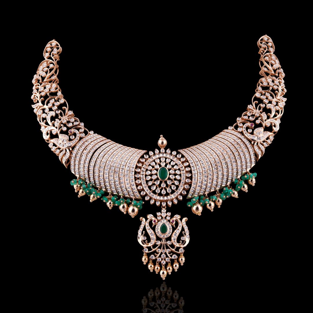 The PNK0939 necklace, a masterpiece from Kothari Jewellers, is a stunning and elegant piece that will elevate any outfit. This exquisite necklace features a captivating arrangement of round diamonds, vibrant green emeralds, and radiant rubies, set in 18-karat rose gold.