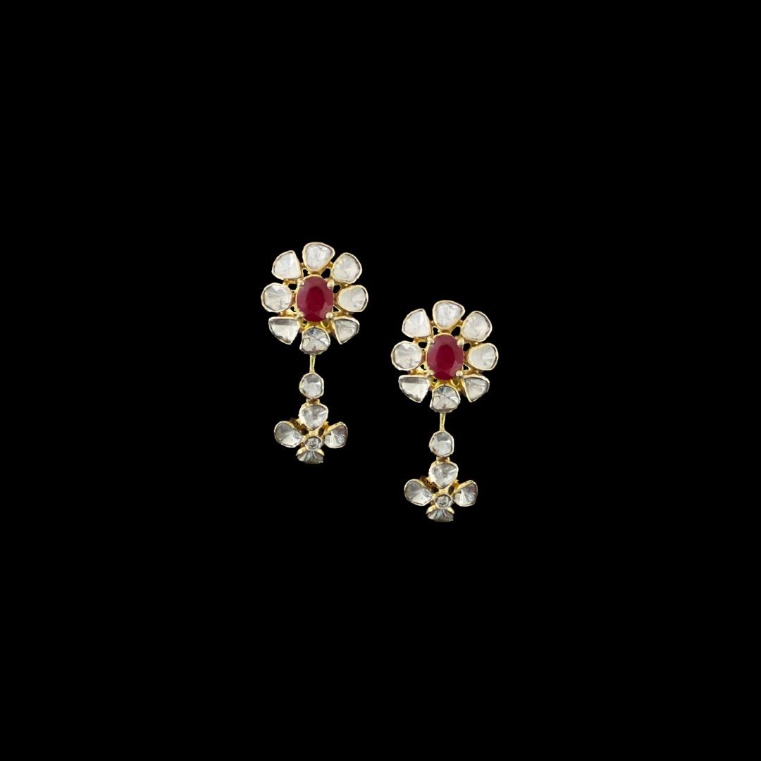 The center ruby, designed in a floral shape, carries symbolic significance. The ruby represents love, energy, and passion, making it a meaningful addition to these earrings. The floral motif adds a delicate and timeless feel, making these earrings perfect for anyone who values beauty with a deeper meaning. - Diamond Accents for Added Sparkle
